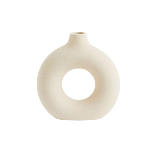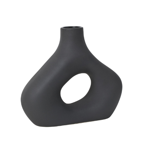 Jarrón circular en cerámica. Diámetro 30 cm, altura total 31 cm. Diámetro de la abertura 5.5 cm.